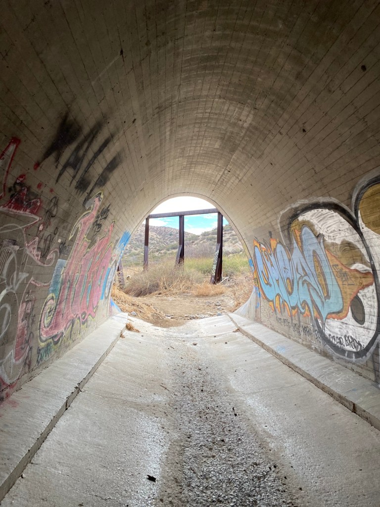After about another half-mile or so, I arrived at the tunnel. The tunnel was built when California State Route 14 was built in the 1960s. The tunnel allowed for Escondido Creek to continue its flow through the park. It also serves as a passage for wildlife such as black bears, mountain lions, raccoons, and other fauna to cross under the highway. On this day, the tunnel would provide a shady spot for me to eat my snacks, which I did while walking through the tunnel to see what was on the other side.