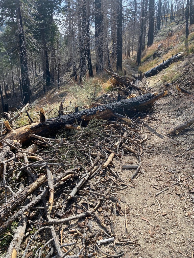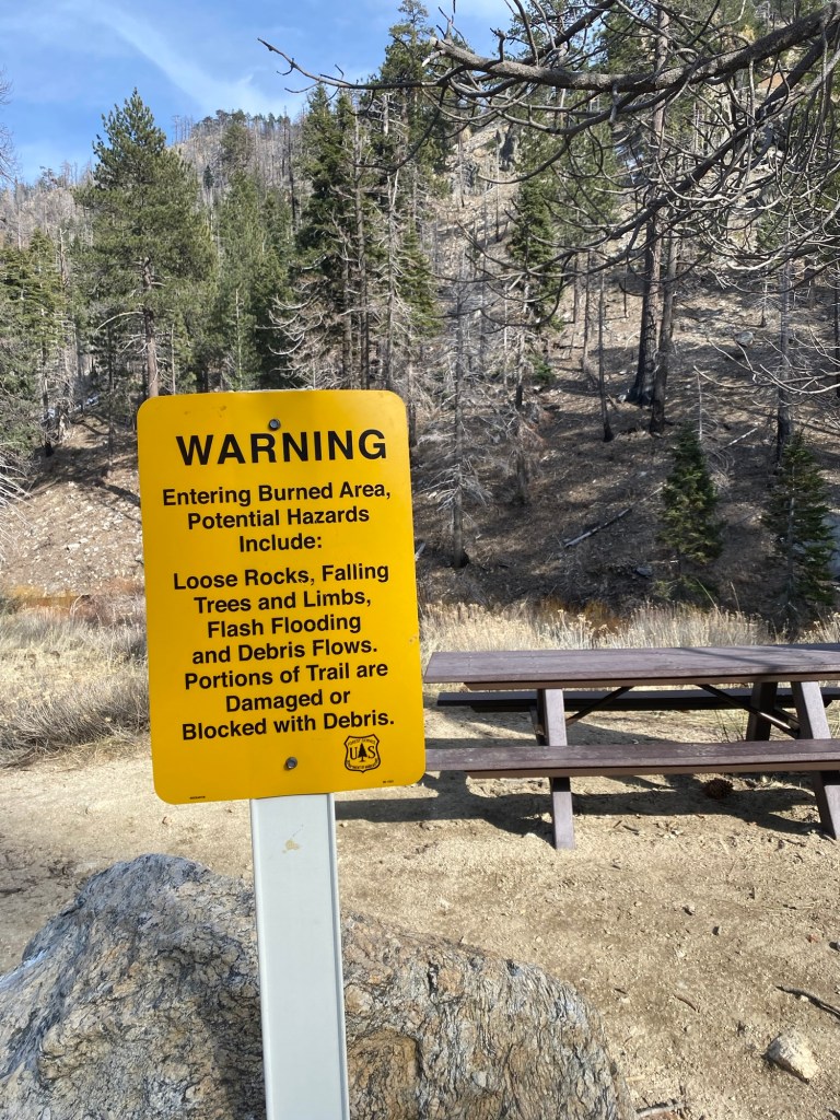 While I considered the trail was pretty safe, there were a few narrow portions that required my concentration. Fortunately, those parts didn’t involve a great drop. We also saw a number of burned logs and fallen trees. Other than the tree that blocked the stream crossing, these were not much of a hindrance to the hike, and it was easy enough to either go around the blockage or climb over it. That said, if weather or trail conditions seem sketchy, it could be a good idea to reschedule. The mountains will still be there when it is safe to return. There were other signs warning against hiking during high wind events and other inclement weather.