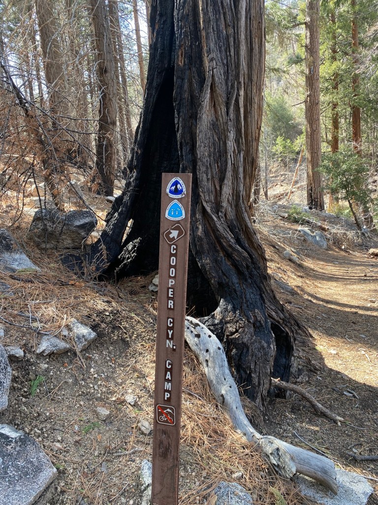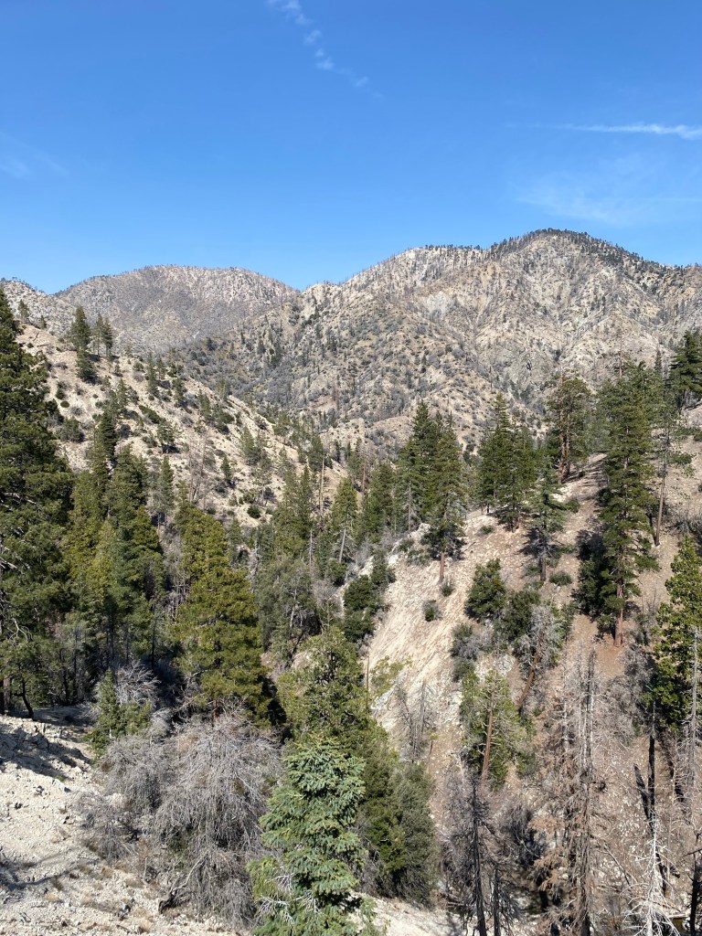 We noticed several bright yellow signs at the start of the trail warning hikers of potential dangers on the trail as a result of the Bobcat Fire in 2020. Falling trees, loose rocks, and blocked trails were among the possible hazards. Indeed, we did see a number of trees with burn scars, and there were several points on the trail where we had to climb over or under logs. There was one stream crossing that was impacted by a large tree; I twisted funny when I crawled under the log while trying not to fall back into the stream I had just successfully crossed.