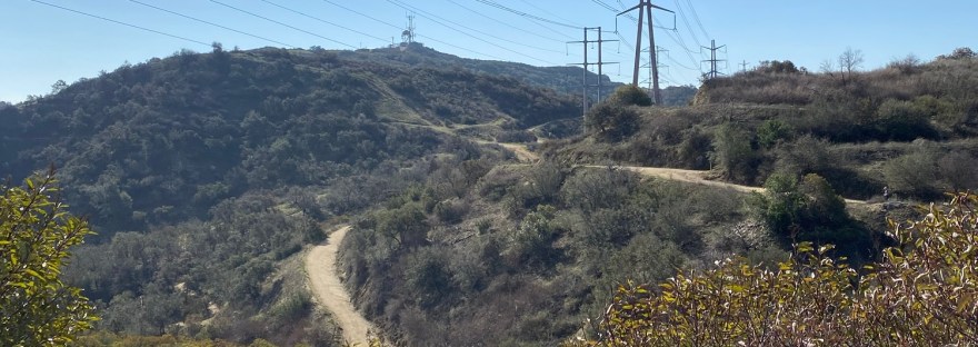 We hung out and ate a trail snack on the bench before heading back down. We hit the Ridge Motorway, making a look back toward Forest Hill. Our total mileage on this trek was only three miles exactly, according to Strava, with a 625-foot elevation gain. The combination of trails would be considered moderate; with the cooler weather, it felt pretty easy. A few photos of the scenery below, and we headed back to the Subie. Of course, we made a stop for brunch in La Cañada.
