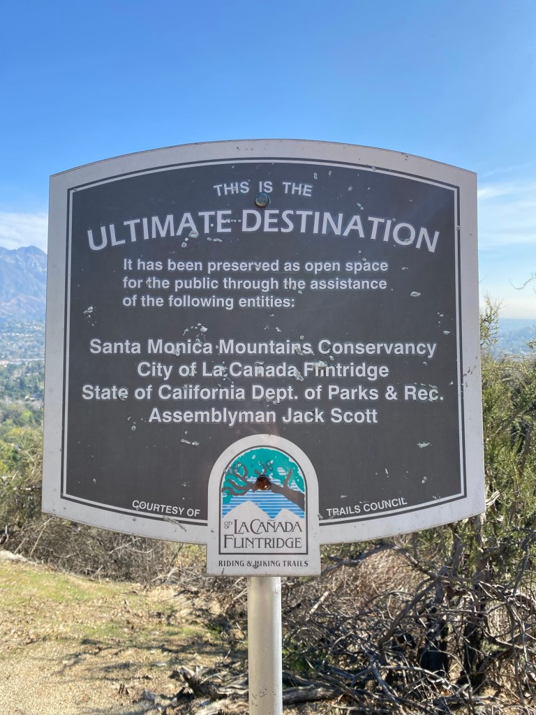 After swinging for a few minutes, we continued on. Our next goal was to get to Ultimate Destination, via the Ultimate Destination Trail. This spot has a not-too-difficult uphill with lovely views of the San Gabriels and La Cañada below.