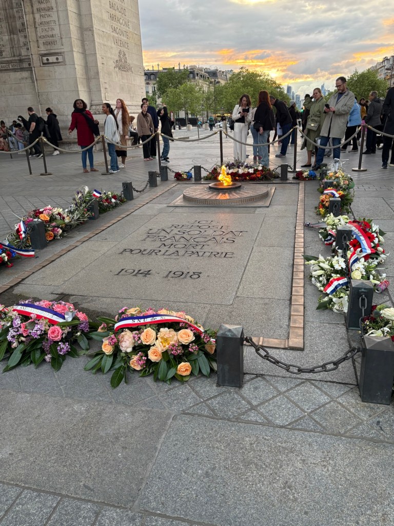 A ten minute walk before dinner allowed us to see the luxury stores along Champs-Élysées. Our destination, however was the Arc de Triomphe. The Arc de Triomphe is an historical monument first commissioned by Napoleon to honor his armies’ victories. Its construction evolved through the reign of several kings in over the thirty years it took to complete the build. Today, it commemorates French military victories. Below the arch lies the Tomb of the Unknown Soldier, honoring a fallen hero who gave the ultimate sacrifice during World War I. Since 1923, the eternal flame has burned over the tomb, as a reminder of the sacrifices made by soldiers in World Wars I and II.