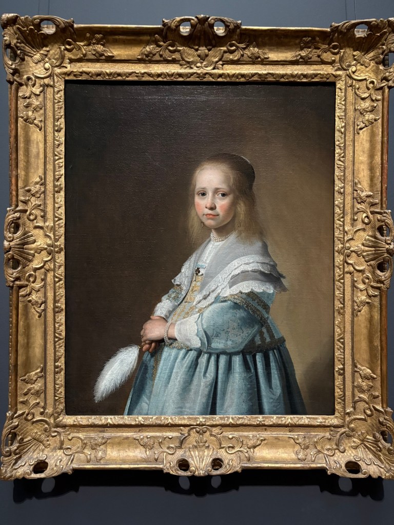 On the second floor, we came to one of the highlights of the visit, the famed Gallery of Honour. The gallery is a large room, with walls intricately decorated with the crests of the Dutch provinces and their capitals, and high domed ceilings, reminiscent of a church nave. The paintings a the top of the walls are scenes from Dutch history that epitomize patriotic values such as Charity and Self-sacrifice. In the alcoves, we gazed upon the works of the Dutch masters: Vermeer, Rembrandt, Leyster. Some of my favorites are shown below. Apparently, I have developed an affinity for Vermeer. I noticed that the color scheme in his ‘Milkmaid’ has some similarity to ‘The Girl with the Pearl Earring,’ which we saw at Mauritshuis last year.