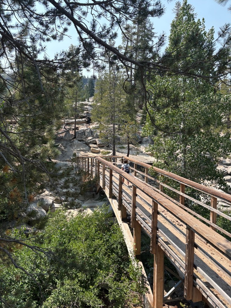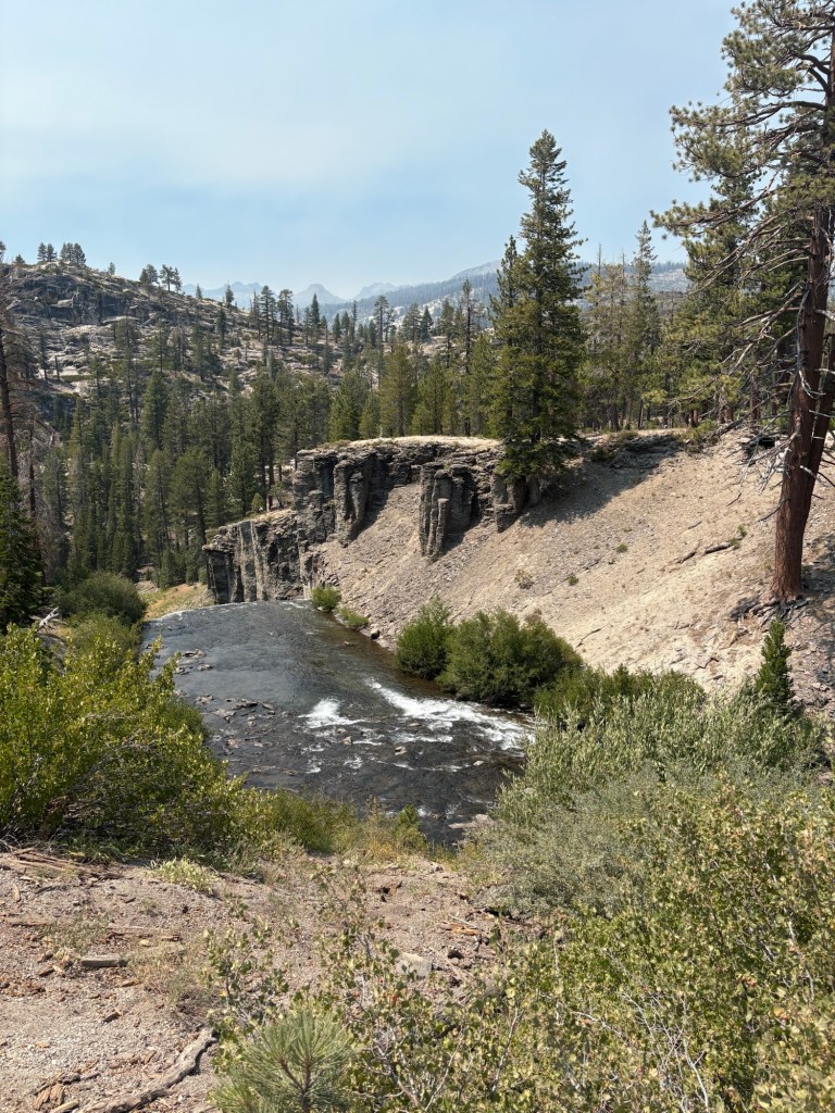 We watched the water falling over the volcanic rocks, and debated whether we wanted to follow the trail descending to the base of the falls. As we were short on time and did not bring our swim clothes into the park, we decided against it for this trip. So we headed back the way we came, stopping to take photos of the river upstream from the falls. We headed north toward the stock bridge, crossing over and continuing on the John Muir Trail and Pacific Crest Trails.