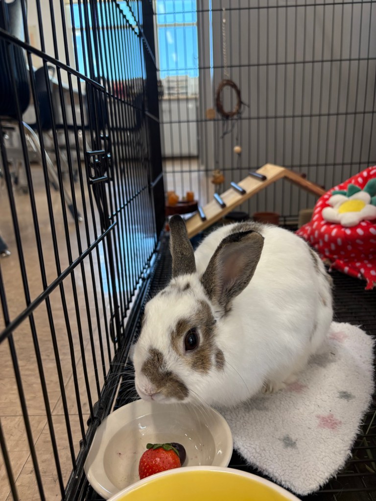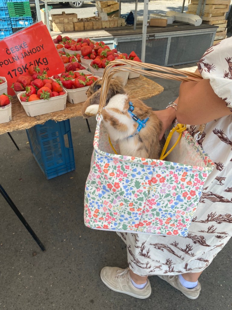 With the $40 I had wired her, Emily had adopted Scout Juniper from Pet Center. She was the sweetest baby, with a side of mischief. I was able to meet her when we visited in November 2021, and she was so small and light, especially compared to Penny, who is a medium-sized bunny. Despite escaping from her large pen and eating four of Emily’s houseplants while we were out one night, Scoutie grew healthy and feisty in the best possible way. She enjoyed her life in Prague, as the spoiled bunny of a college student in a spacious apartment. Even when Emily briefly fostered a dog who had survived the war in Ukraine, Scout was still a comfortable little bunny whose main roles were to eat, sleep, eat, cause chaos, and eat. She especially loved the fresh jahody from the farmer’s market near her apartment.