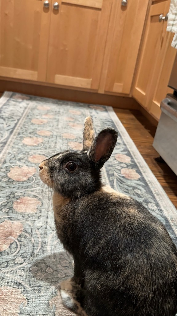 Well, fast forward less than five years. We adopted Penny in 2020, just as the Covid19 pandemic was emerging and threatening to upend life as we knew it. One year later, after reading many a bunny blog that mentioned the importance of socializing rabbits, along with mental health struggles, Henry James was adopted into our hearts and home. He and Penny bonded fairly quickly, and they are now inseparable. The pair also got on with big brother Owen, who sadly crossed the rainbow bridge in 2023. But not before he was able to meet our third bunny: my class rabbit, Oliver Jack. Oliver was followed by my ‘grand-bunnies,’ Scout and Pippa, who traveled over literally thousands of miles across land and sea to come to California. In the spirit of Thanksgiving, here are the stories of Oliver, Baby Scout, and Pippa Squeaks.