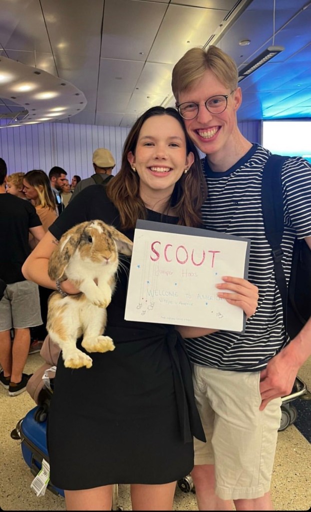 But before Baby Scout turned two, her life was about to change. Emily and Mees, now planning a wedding, were headed to the United States, and Scoutie would be traveling with them. At the time, only FinnAir allowed rabbits to travel in the cabin for an additional charge. So Emily made sure to get Scout’s vaccine passport up to date, which was a requirement for travel from the EU to the US, and a comfortable carrier that would fit under the seat. And they boarded their flight from Prague, making their way to Los Angeles via Helsinki.