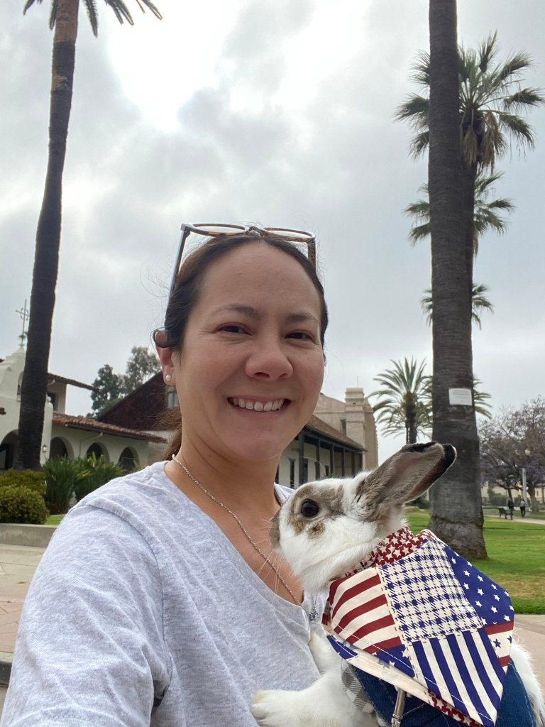 This time, Mees and Pippa cleared customs fairly quickly. We were also prepared with a much nicer sign. But this is where things stopped being easy. We continue to learn the hard way that immigration is complex, expensive, and slow here in the United States, and once again, Pippa’s family had to return to Europe. We also found that while it was relatively easy to bring a rabbit to the United States from the EU with the proper vaccinations, it was more difficult to return to the EU from the United States. Today, my grand bunny resides with us. She has a nice big hutch, and like her lagomorph family members, is safe and warm inside our home. She usually gets plenty of hopping time outside, or free roams with supervision in Sami’s room. But we can tell that she misses Mees and Emily and Europe. She may also have some trauma from so much travel so early in her life. This bunny has visited more countries than many people have, and without fully understanding what was happening. Still, she is resilient and continues to adapt to her life in California. She finds comfort with Sami, and has learned to relax and even fall asleep in her arms.