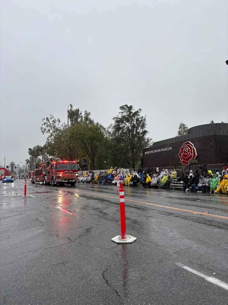 The Tournament of Roses starts with Pasadena Fire Department during a storm.