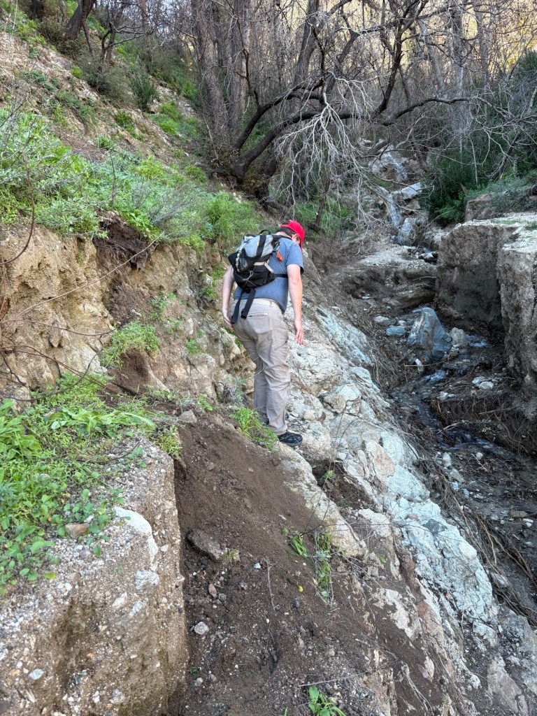 We walked about a tenth of a mile past the first tunnel and came to what is a major obstacle. It appeared that the rains overwhelmed the culvert, and as a result, the trail had been washed away. We considered whether this was a hike-stopping hindrance, and decided that we could safely make it across the washout given the water level with some careful climbing.