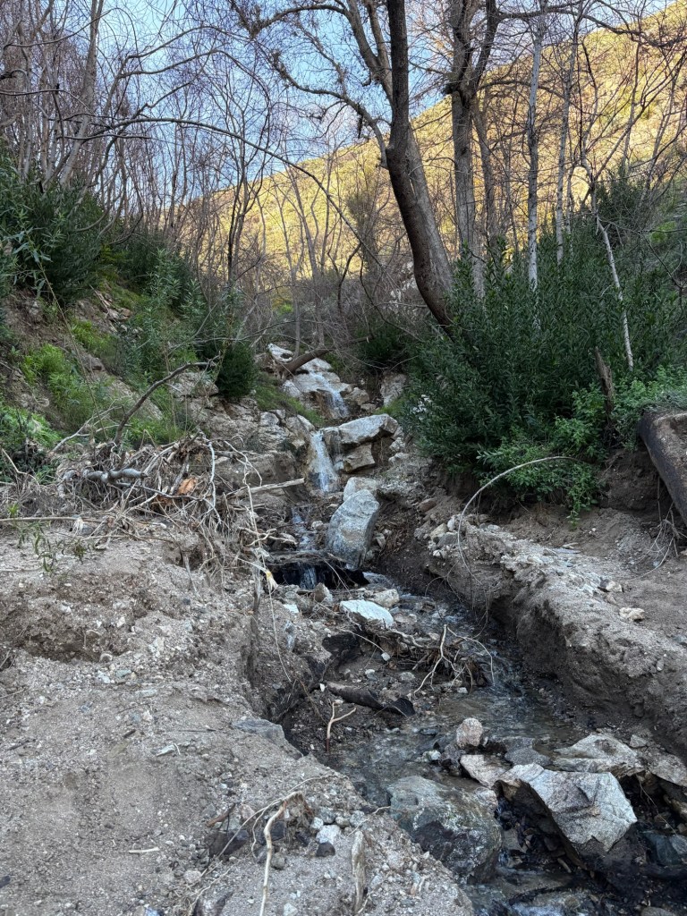 The drive up San Gabriel Canyon to East Fork Road, looked much as it always does, winding and beautiful. A notable difference is some post-fire construction and LA County Public Works clearing debris from the San Gabriel River. Usually the waters in the San Gabriel Dam is a deep blue; on this trek, it was brown thanks to the sediment and debris from recent rains and mudflows. But otherwise the drive was uneventful. We turned onto Shoemaker Canyon Road and drove the two miles or so to the parking area. A quick application of sunscreen and we hit the trail.